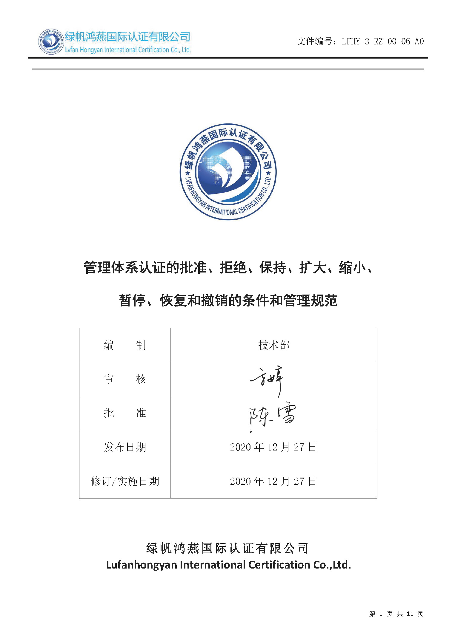 綠帆鴻燕國際認證有限公司(簡稱LFHY)是經國家認證認可監督管理委員會批準的第三方認證機構